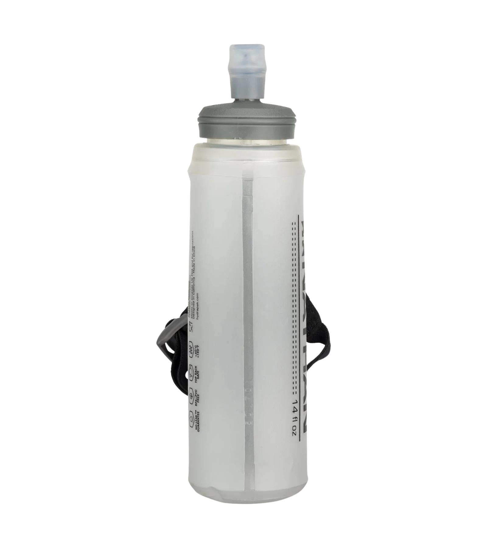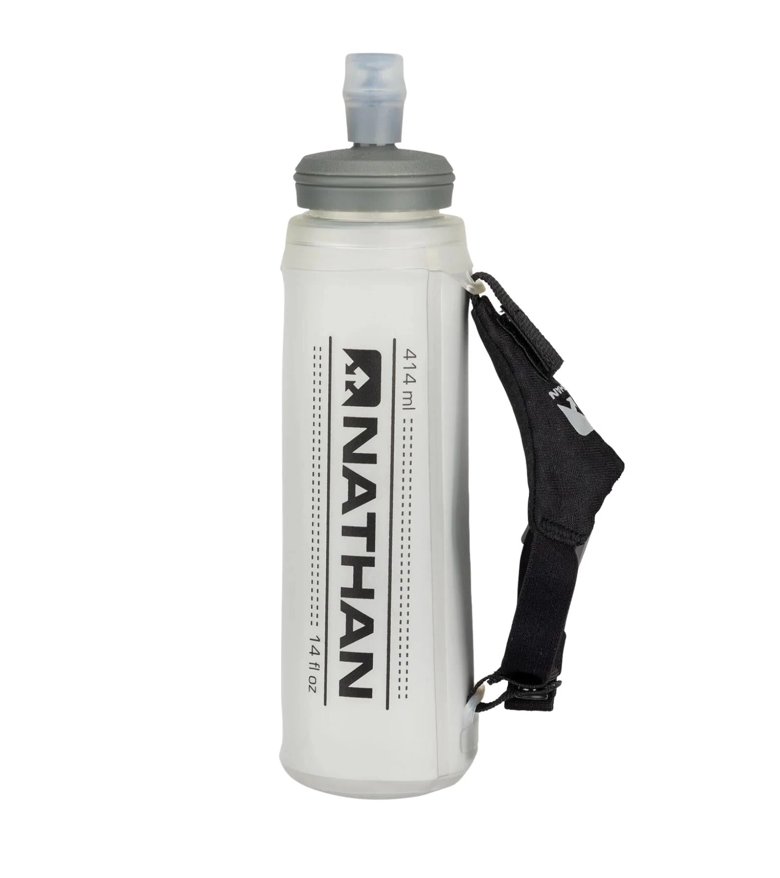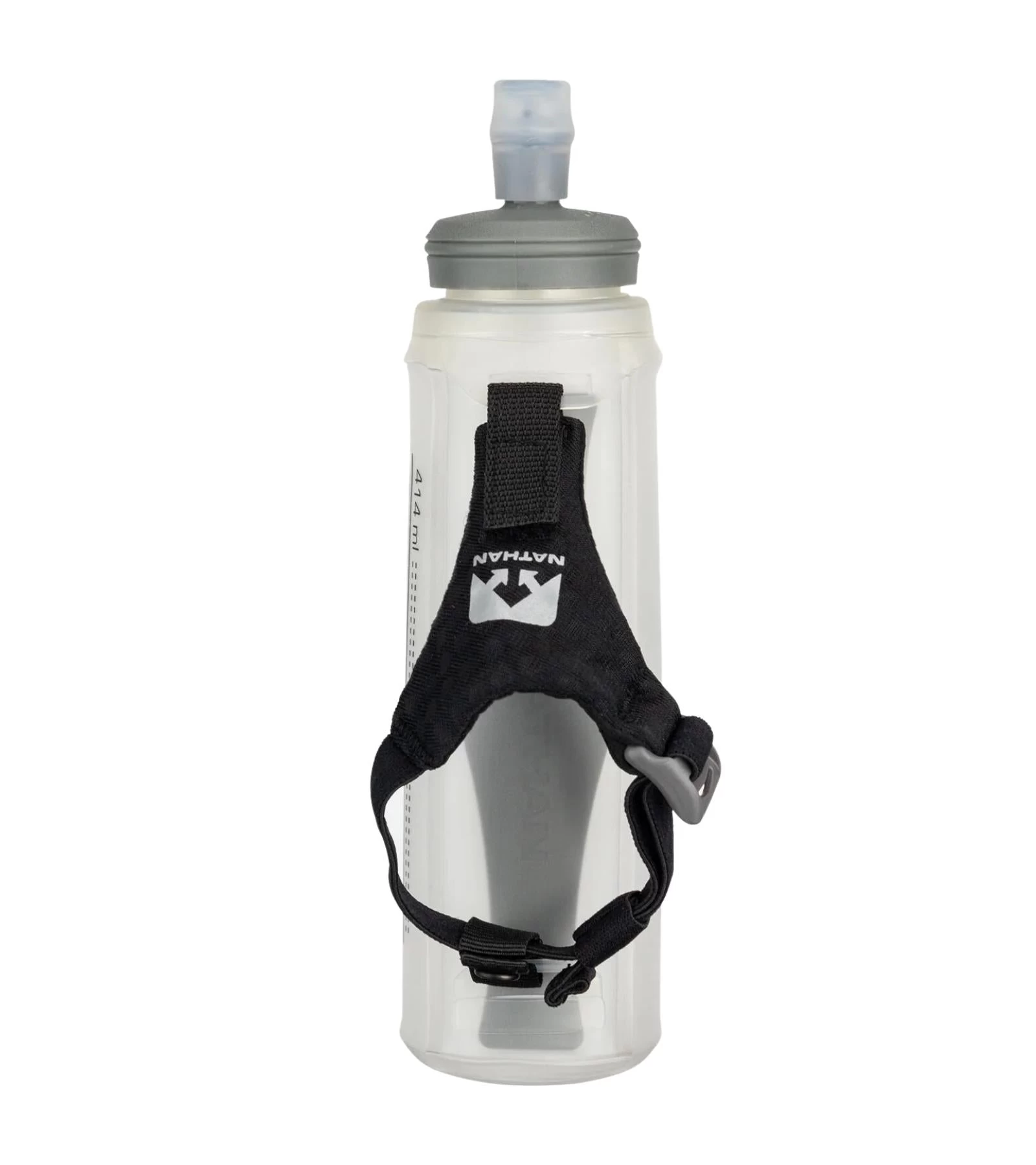 There’s no replacement for the classic soft flask handheld, but there’s always room for innovation. The Nathan ExoShot Lite 14 oz is the latest in hydration that features an integrated hand strap and rigid ExoSpine™ giving you premium comfort and efficiency when you’re on the run. The ergonomically designed hand strap can be adjusted to fit your unique hand shape and feels more natural to maximize your running efficiency. The mesh under your hand is made with breathable, moisture-wicking fabric to help mitigate hot spots and provide enhanced grip. This handheld soft flask is perfect for marathons, short runs, trail runs, or really any activity where you want to stay hydrated.