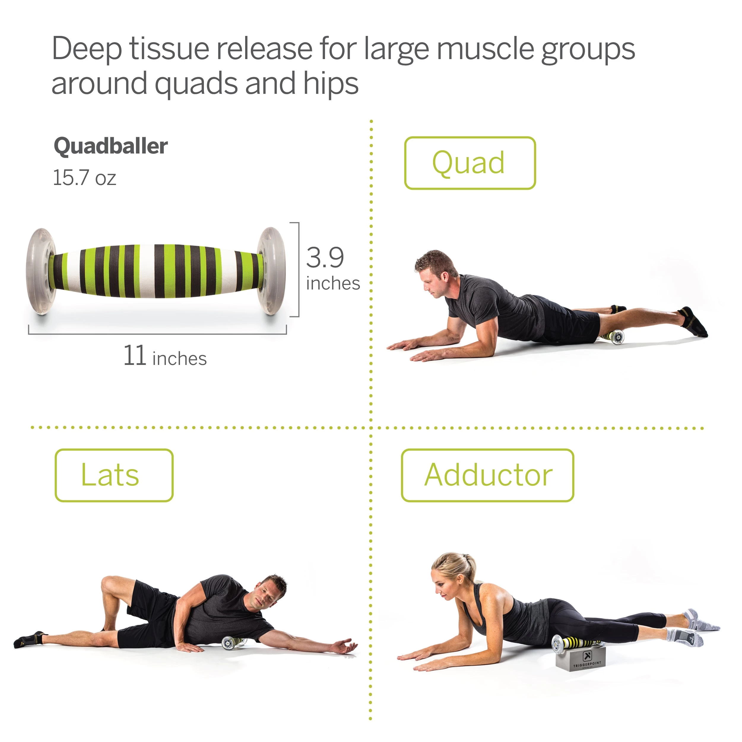 - Baller Block: Provides elevation for optimal range of motion and application of pressure when using TriggerPoint products. Also, reduces space and houses the Footballer when not in use.